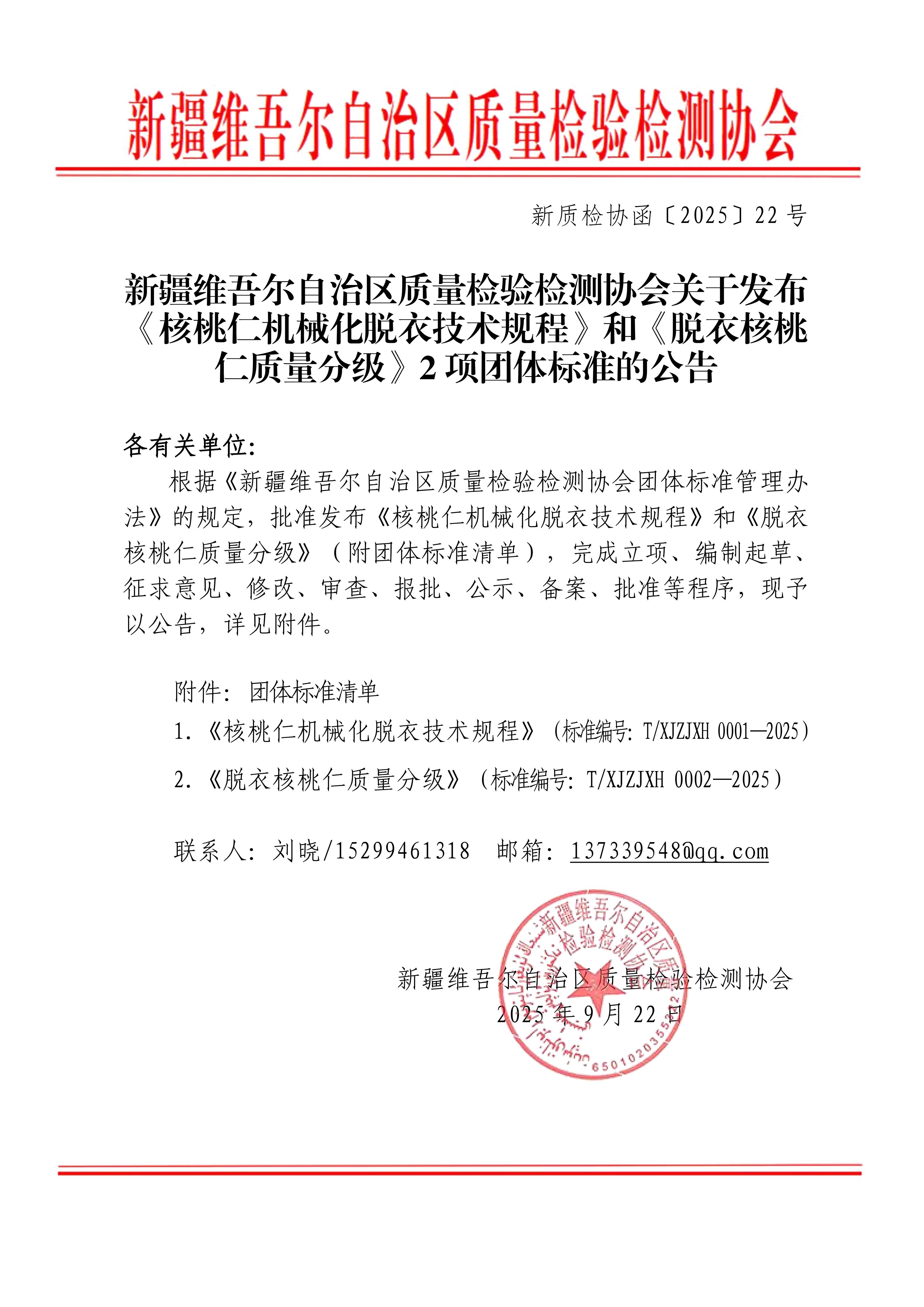 关于发布《核桃仁机械化脱衣技术规程》和《脱衣核桃仁质量分级》2项团体标准的公告