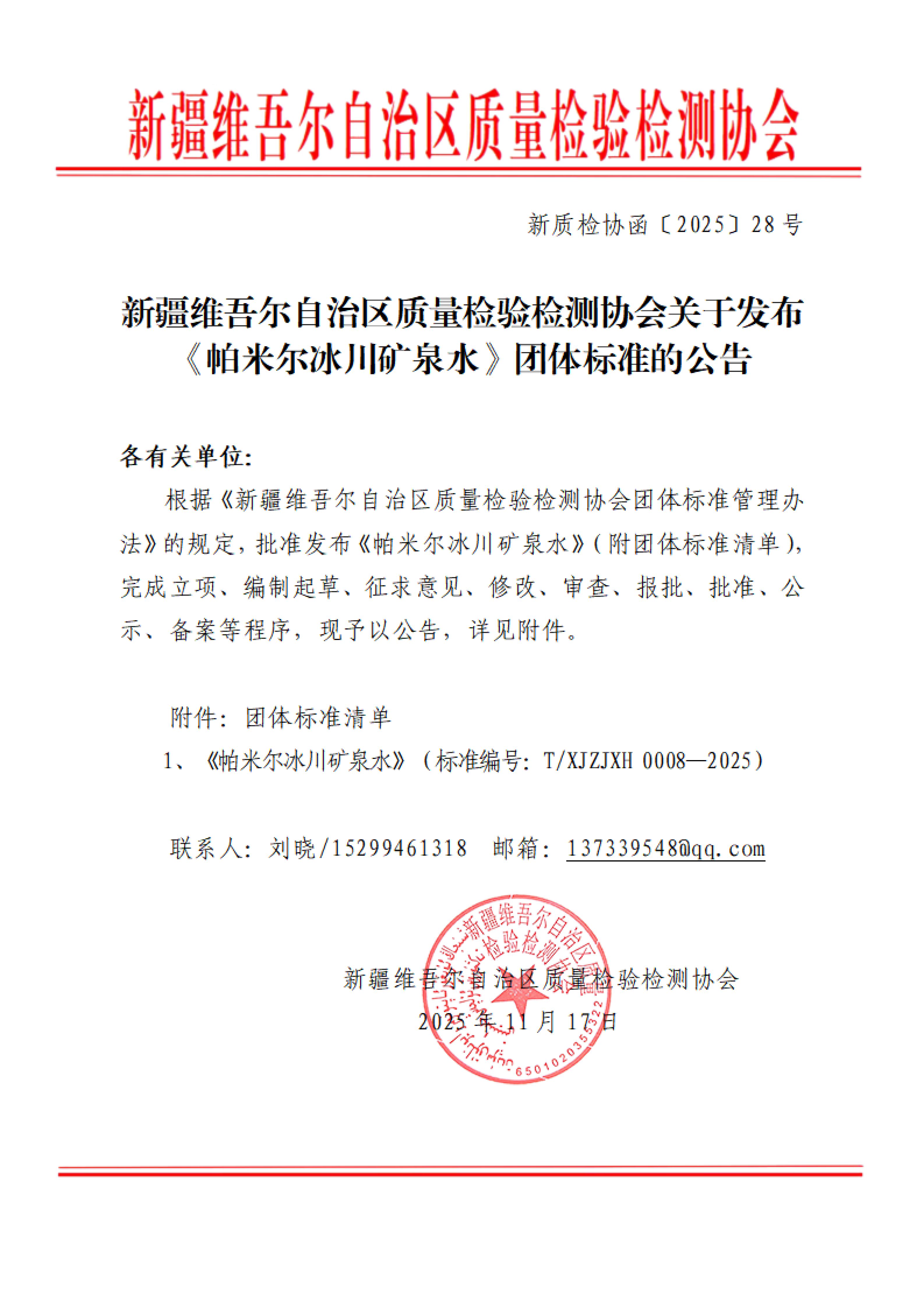 关于发布《帕米尔冰川矿泉水》团体标准的公告