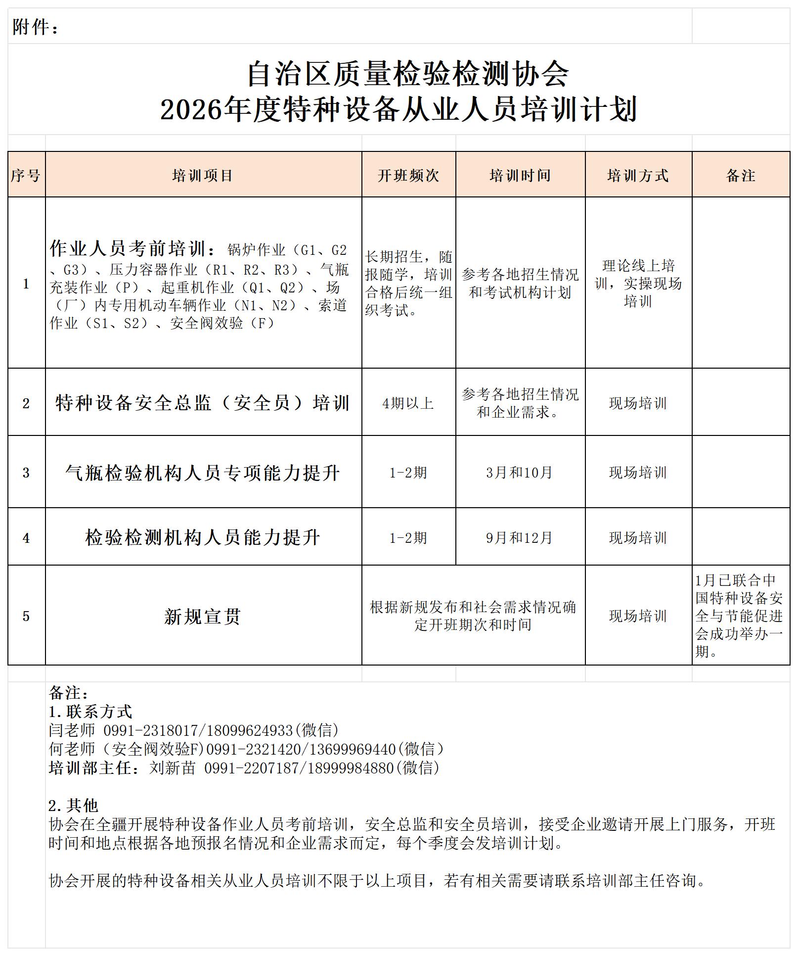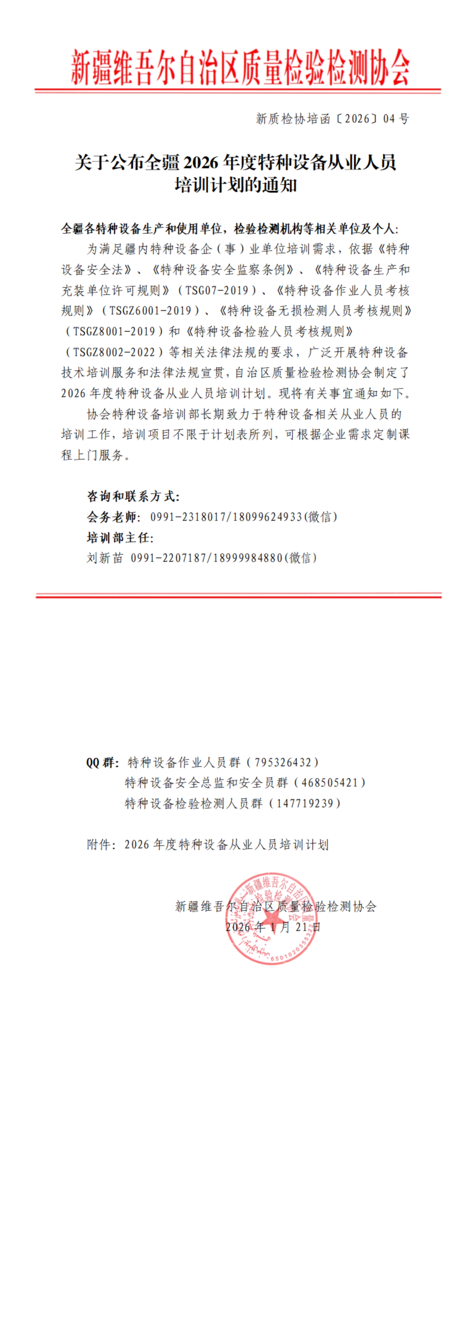 关于公布全疆2026年度特种设备从业人员培训计划的通知