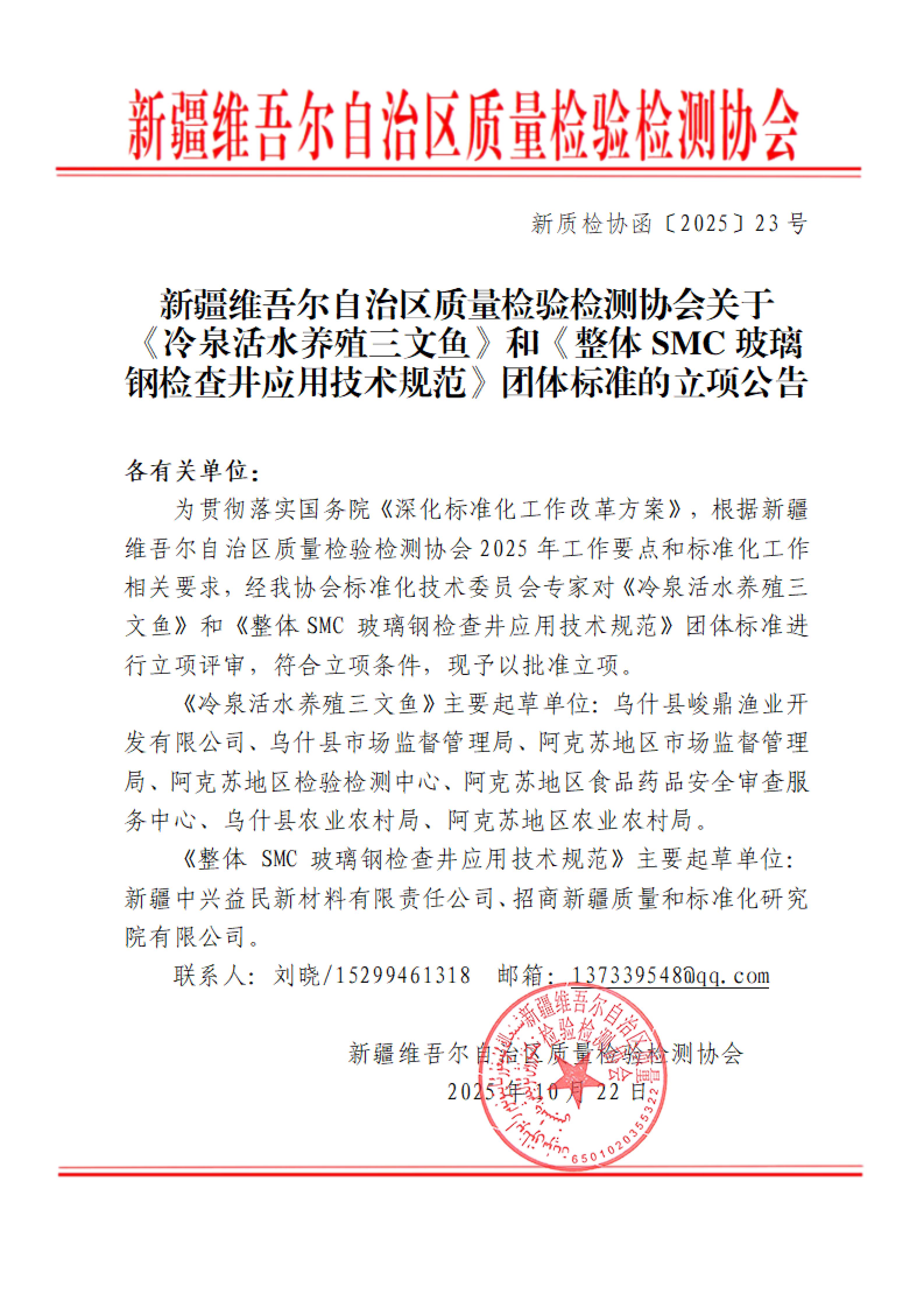 关于 《冷泉活水养殖三文鱼》和《整体SMC玻璃钢检查井应用技术规范》团体标准的立项公告