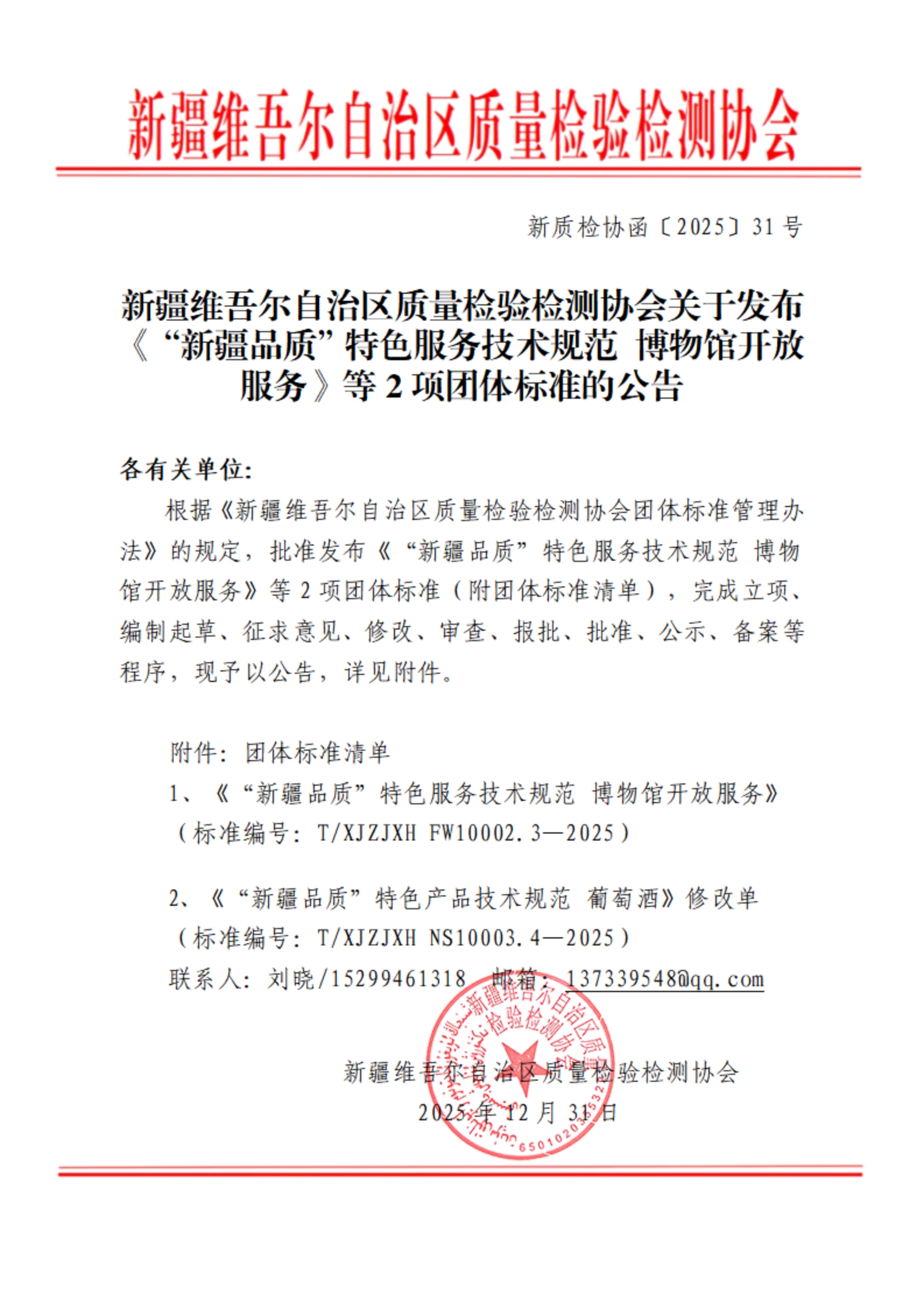 关于发布《“新疆品质”特色服务技术规范 博物馆开放服务》等2项团体标准的公告