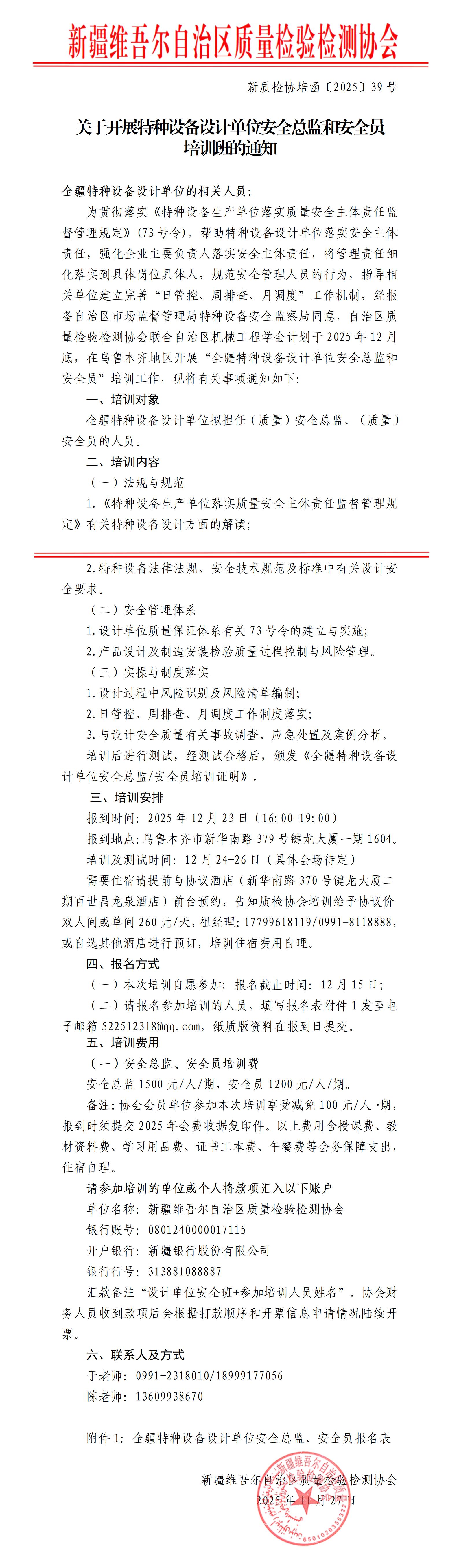 举办12月特种设备设计单位安全总监和安全员培训班的通知