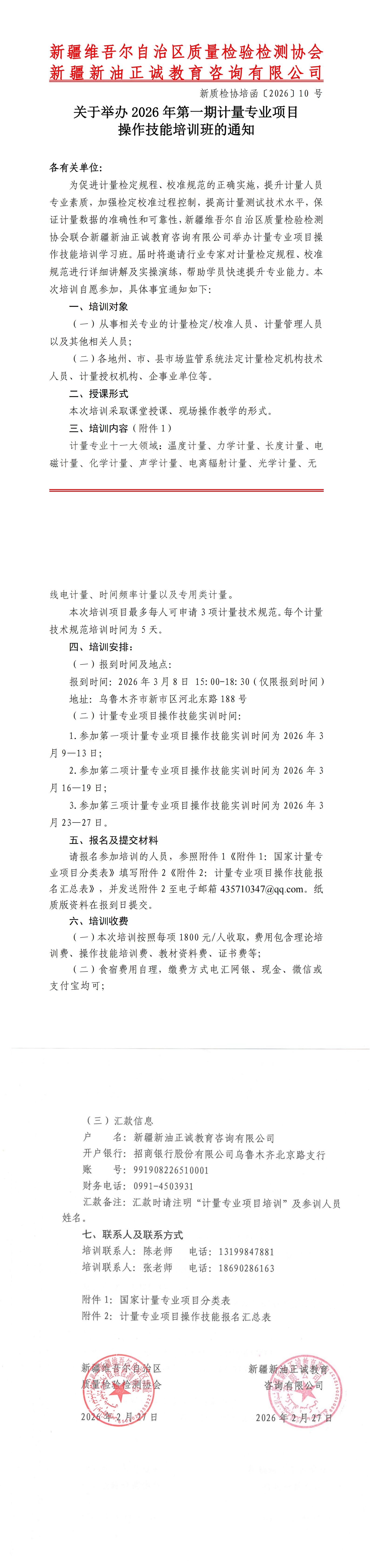 关于第一期计量专业项目培训班通知