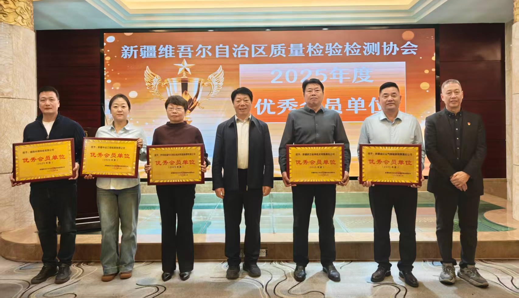 会议首先对2025 年度表现突出的优秀会员单位进行表彰。为表彰先进、树立标杆,激励全体会员单位主动担当、积极作为,会议对喀什地区特种设备检验检测所等10家2025年度表现突出的优秀会员单位进行了表彰,自治区市场监管局李德新巡视员与协会理事长赵庚卯为获奖单位代表颁发奖牌并合影留念。大会号召全体会员单位以优秀为标杆,凝心聚力、奋勇争先,共同推动行业高质量发展。